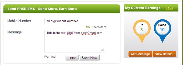 Yeah thats true, Send Free SMS and Get Free Mobile Recharge anywhere in India. As you know there are already many other websites for Free SMS service in India. E.g. Way2Sms, FullonSms and many more. But with them you can only Send Free SMS, you will not Get Free Recharge on sending sms. But there is a website that pays you each time you Send Free SMS. From that collected paid amount in your account you can use to Recharge Your prepaid Mobile. This is a very fresh concept in which we are getting everything for free. We are sending Free SMS and getting paid, once our account reaches to Rs. 10 we can Recharge our prepaid mobile. If you hate signups and login each time you want to send SMS then .